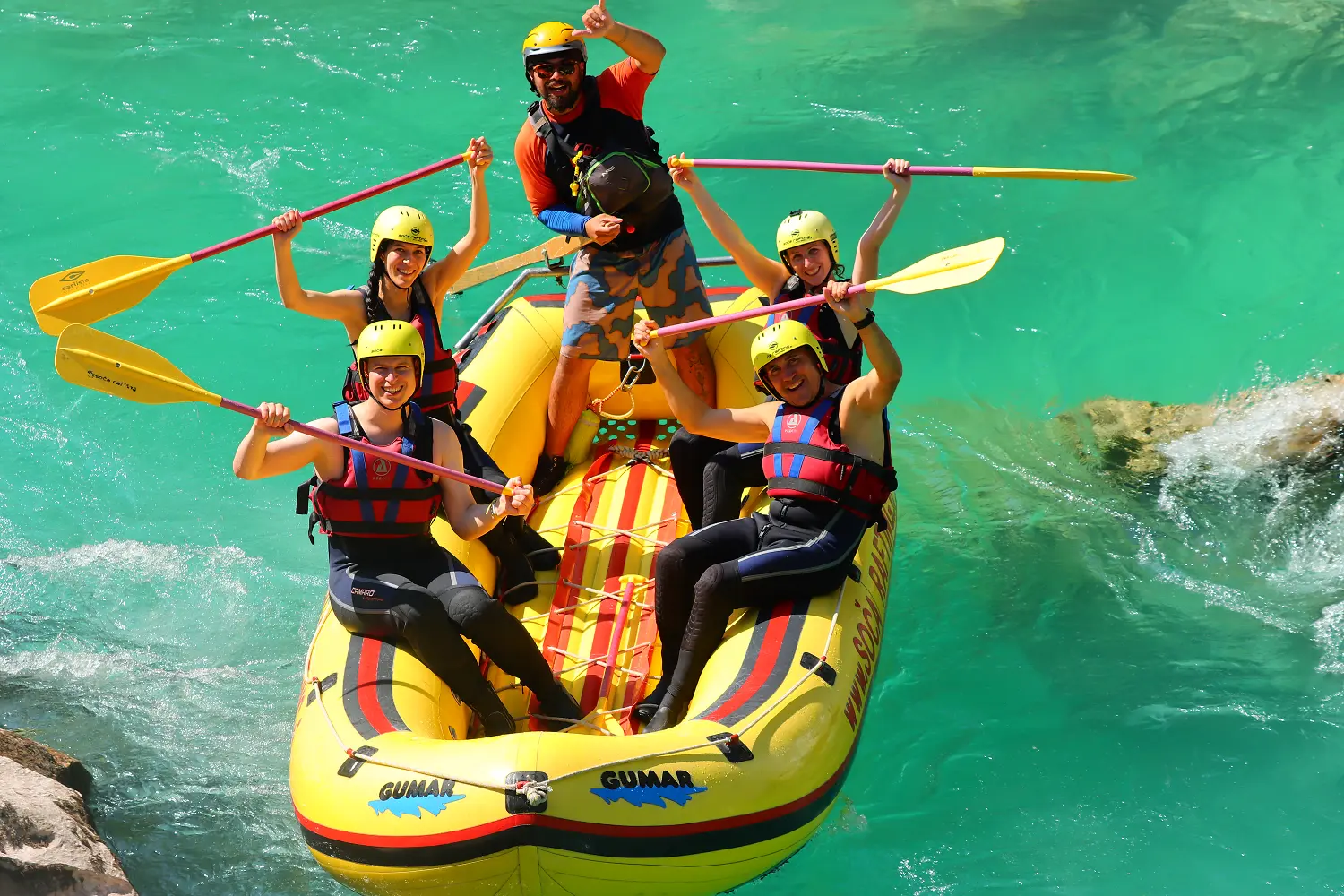 When visiting the Soča Valley, don't miss the unique experience and join a rafting trip along the Soča River with us.